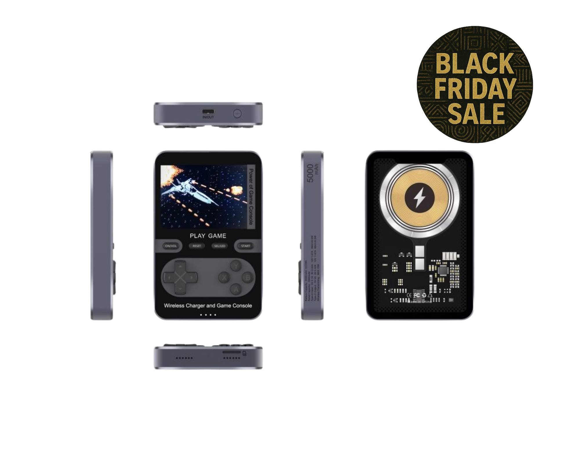 This compact 3-in-1 multifunctional device doubles as a 5000 mAh wireless power bank, a retro handheld gaming console, and a wireless charger for your phone or earbuds.